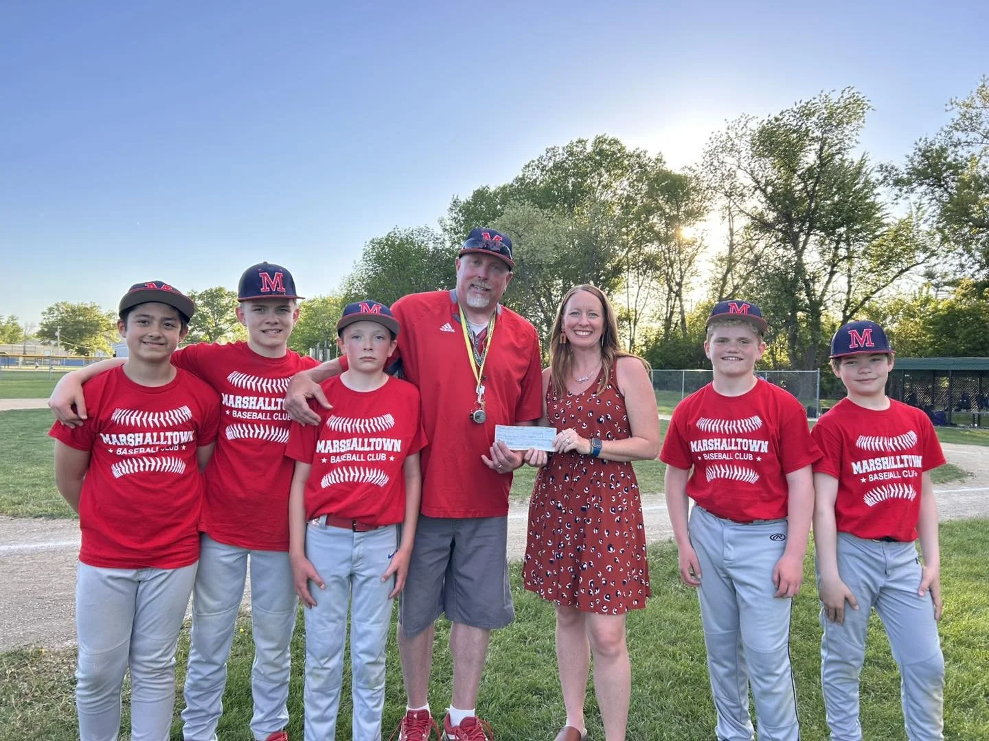 May 2025 | Vice President Kyley Leger presents a check to Marshalltown Baseball Club in support of their Marshalltown Little League field improvement project. Pictured: Corey Schoenfelder alongside 5th and 6th grade players.